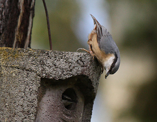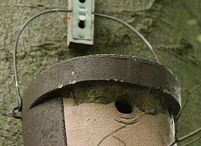 Foto links: Beim Nistkasten auf dem Bild hat der Kleiber einen breiten Streifen Lehm-Mörtel oberhalb des Flugloches angebracht. |